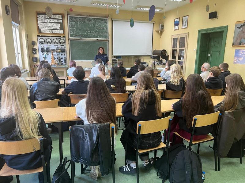 Aspirant Barbara Gaweł spotkała się z uczniami klas pierwszych Liceum Ogólnokształcącego numer 1 imienia Jędrzeja Śniadeckiego w Dzierżoniowie. Podczas zajęć omówione zostały zagadnienia związane z odpowiedzialnością prawną osób nieletnich, przejawami demoralizacji, a także zachowaniami ryzykownymi w Internecie, takimi jak hejt, cyberprzemoc oraz nieodpowiedzialne udostępnianie treści.