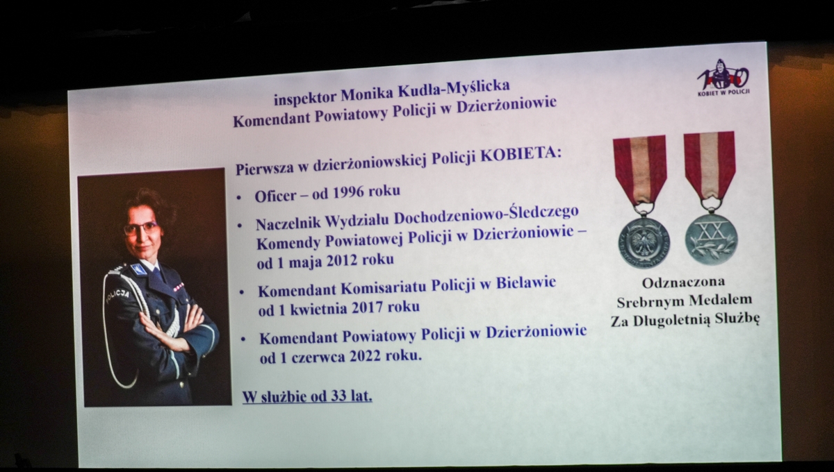 26 listopada 2025 roku w Kinie „Zbyszek” w Dzierżoniowie odbyła się uroczysta gala podsumowująca obchody setnej rocznicy służby kobiet w Policji. W wydarzeniu uczestniczyły funkcjonariuszki i funkcjonariusze, przedstawiciele władz samorządowych, zaproszeni goście, a także Orkiestra Policyjna Komendy Wojewódzkiej Policji we Wrocławiu. Uroczystość była zwieńczeniem szeregu przedsięwzięć organizowanych przez Komendę Powiatową Policji w Dzierżoniowie z okazji jubileuszu.