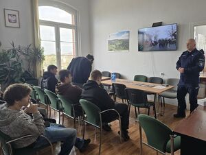 Funkcjonariusze oraz przedstawicielka Zespołu Kadr i Szkolenia rozmawiają z młodymi osobami o możliwościach, jakie daje służba w Policji. Przedstawiają zalety tej ścieżki zawodowej, takie jak stabilne zatrudnienie, możliwość rozwoju, zdobywania nowych umiejętności oraz realny wpływ na bezpieczeństwo społeczeństwa.